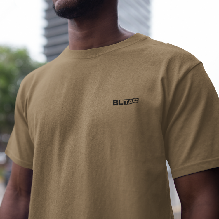 Man wearing an olive army green t-shirt with BL TAC brand logo on left chest on a gray background
